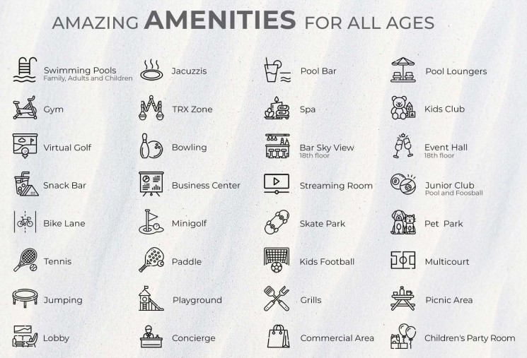 Aurora Towers offers more than 30 amazing amenities necessary for an ideal lifestyle such as pools, gym, spa, bowling, virtual golf and much more.