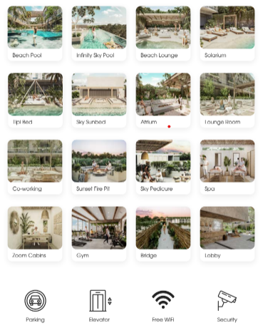 20 luxury amenities, 2 elevators, infinity sky-pool, zoom-rooms, gym, yoga, massage, pedicure and much more.